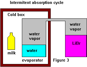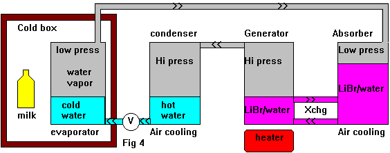 kitchen physics. Before we talk about absorption let's talk about a simple compressor fridge. ![]() In the above text I've explained how we can cool water by boiling in at low pressure, we've also seen how we can heat things by condensing vapor into liquid. So let's make a simple cooler to keep the milk for the tea fresh. Let's make a small thermally insulated box and inside it place a flask of water (the evaporator) with a pipe running from the top of the flask to a pump outside the box.. We run the pump, lower pressure, boil the water and lower the temperature. We might call this an intermittent compressor fridge because we need to stop it once in a while to refill the water. Since