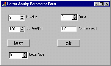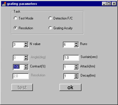 We can change the N value and number of runs using "spinedit" boxes (see image). The grating angle can not be changed in the resolution mode and is ghosted out in this mode - angles are in integer degrees. The resolution can only be set in the test mode and is ghosted in other modes. The Contrast would normally stay at %100 but can be changed to any integer value. The sustain value is in seconds and is limited to around 10 seconds - this depends on the monitor frame rate. The sustain and decay values are in frames and must not be zero.