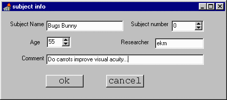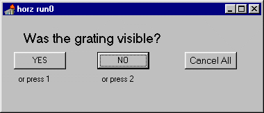 How the subject response is entered into the computer varies with the type of test and selected options for that test. Initially the keyboard or mouse will be used but a response box is likely to be added at a future date.  Generally the subject will enter their response directly ( i.e. for grating and CSF tasks) but the researcher will enter the response in the case of the letter acuity test. For the grating and CSF tasks the response is either YES/NO,  HORIZONTAL/VERTICAL or FIRST/SECOND depending on the options selected. For the letter acuity task the subject calls out the letter they see and the researcher enters CORRECT/INCORRECT.