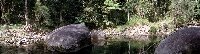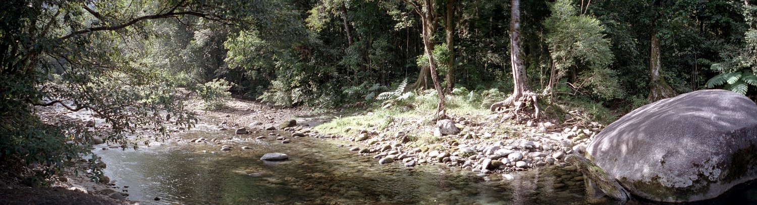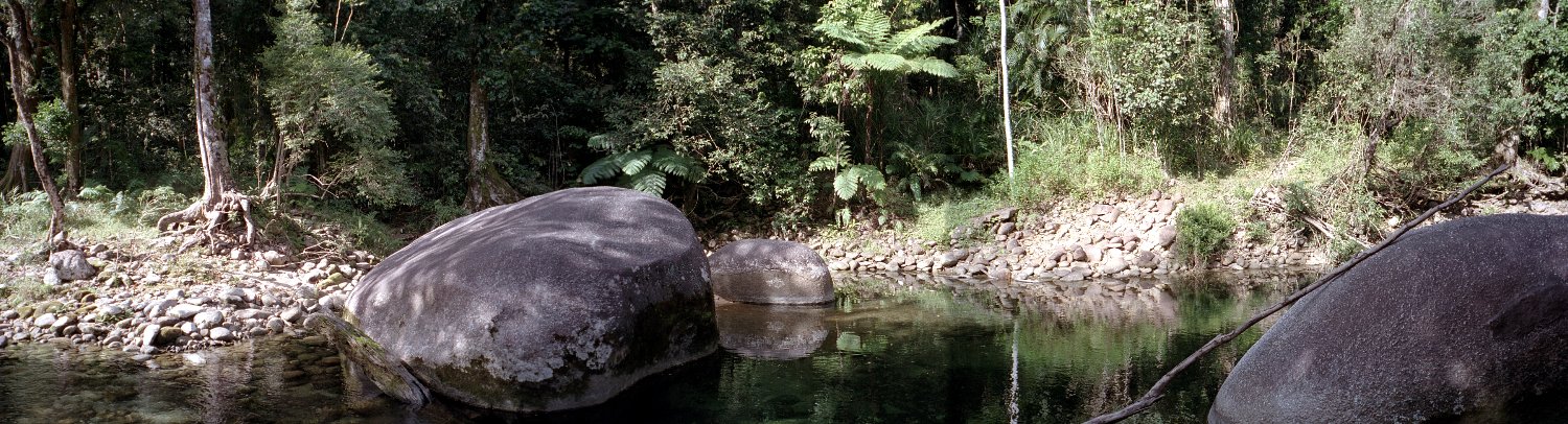 These photos were taken at "The boulders" at Babinda. The top one is a stitch of 10 negs. The bottom two are from a subset of these. The original stitched images were 8674*948, 3333*934 and 3608*1008 pixels. These reduced ones and 2000,1500 and 1500 pixels wide. The files are 293K, 259K and 267K in size. The film is kodacolor-100 gen-6. |