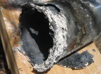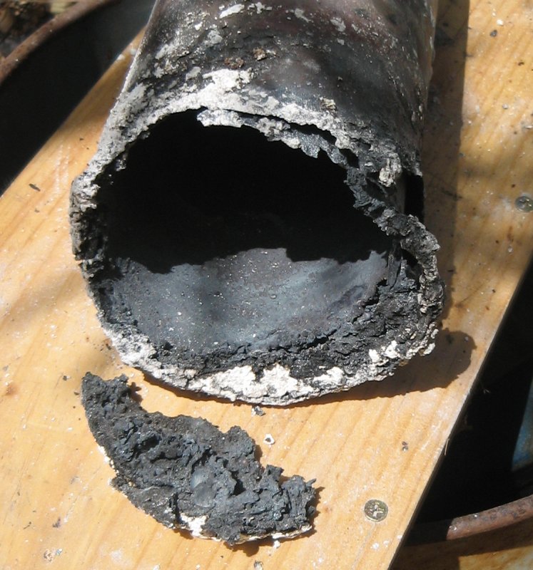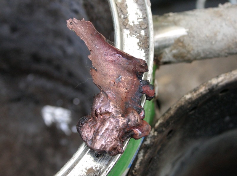 I remember the metal igniting but didn't know was going on at the time. The flask move a bit and the sounds changed. The fire which was already white hot seemed to intensify and white sparks blew out through the top. It reminded me of steel making furnaces I'd seen on TV. There was also a strange smell. I had a sort of “is she going to blow” feeling but when everything seemed stable I tested again with the skewer. It appeared to have melted at the tip and on the end was stuck what appeared to be molten metal. When stuff is that hot you just see the glow not the real colour. The skewer was slightly melted but on cooling the bulk of the material was black oxide. If it really was molten ferric oxide then the temperature reached 1565 deg. I'm not convinced that is the case because stainless steel is an alloy so other metals are present along with the big dose of copper I'd added. Copper oxide melts at only 1201 deg but I would have expected green flames if the copper burned. |