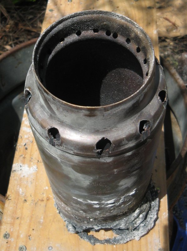 Please read my turbo-stove pages first. In a turbo-stove we want to heat food or water above the stove. In a metal furnace we want high temperatures in the combustion chamber. The stoves seem to reach around 1000 deg C, the furnace is my attempt to push that up to steel melting temperatures of >1400C. The exact melting point varies with carbon content.