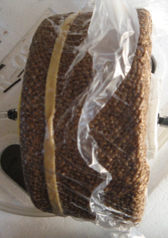 29'th July 2006. The plug was wax cast in yoghurt container. I wanted a little bit of a lip on the top so I made the outer top surface flat using a cheese grater. I also rounded the bottom edge. It took a long time to wrap it in carbon. There are four layers each loosely tied with red cotton to keep it in place. Then a layer of peel ply was added followed by the hessian. Under vacuum it holds it's shape pretty well. This is upside down compared to the previous photo. I infused what was the “bottom” because the “top” has overlapped layers of hessian which would soak up a lot of resin. If there had been more of a taper I would have aimed to infuse the “fat” end. As usual - initial infusion was rapid and slowing to a crawl towards to end. It only took a bit over a minute for the resin to reach the first edge but it took about thirty minutes to go all the way around. Once again vacuum is applied to the infusion port at the end. Sixty ml of resin was used. Here's a video clip of the first minute (10.25 meg). You can see me fill the syringe with resin and the hessian begin to darken a few second later. Cosmetically the outside of the piece is not perfect but it appears to be extremely strong and well bounded. It weighs in at thirty grams. The inside look quite good and some of the fine details from the original plastic tub are visible. I think this is close to prefect for the model I'm making and I could even reduce the thickness by a layer. The laminate does have pinholes. The big problem was removing the hessian from the piece. I will try to improve this but spending a few hours prising it off is not out of the question. The model is larger than this sample and that will make it easy to make. However it is more “boat” shaped and controlling the resin flow is more complicated. |