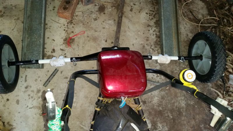 I was not fond of the supplied foot steering arrangement. This was a polypipe wrapped in non-slip material slid over the fibreglass axle.