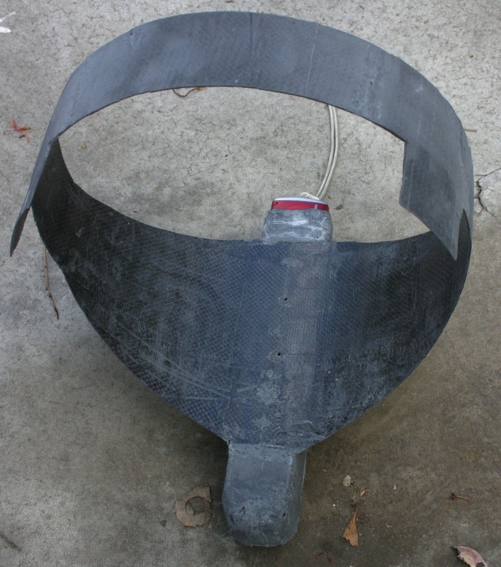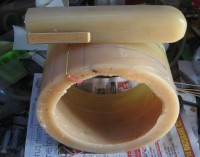 Vacuum resin infusion is my standard way to make composites these days. To make things interesting I infused the shroud and battery tube in one operation so the bounding between the two is as good as possible. The carbon was laid up dry and held in place with sewing cotton and dressmakers pins. The resin diffusion medium is cheap thin shade cloth. The resin was infused through the port in the lower left of the photo and vacuum applied to the inner part of the wax tube (port visible upper right). The infusion port was pointing up during infusion.