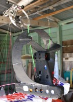 This time I used a larger box-like motor tube. This means I have flat surfaces to attach the fins and I can twist the tube off axis to try to compensate for the motor torque. Here it is tacked in place with CA so I can break the join and reposition it till I'm happy with the angle. Unlike the rainbow, the tube shape also let me run wires around the motor inside the tube so I didn't need to route them through the main fin. The motor tube and main fin were both infused carbon moulded around a wax former. The motor is the dual stator CDROM motor I stole from the rainbow. It is kit built 18 turn delta wound. The blue thing inside the fin is an 18 amp ewatts brushless ESC – quite cheap at $24aus. It is heavier than the phoenix I used previously but a fraction the cost. Power comes from a 1800mah 11.1V LiPo. Deans connectors are used for the battery connection. Foam holds the battery in place and provides crash protection.