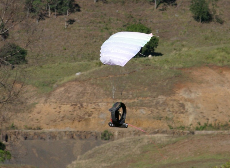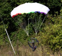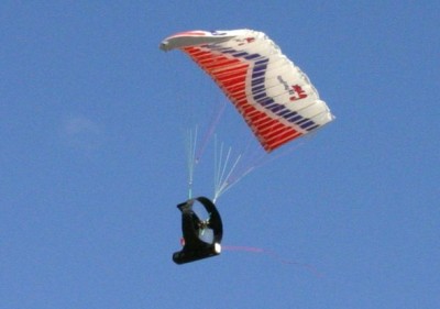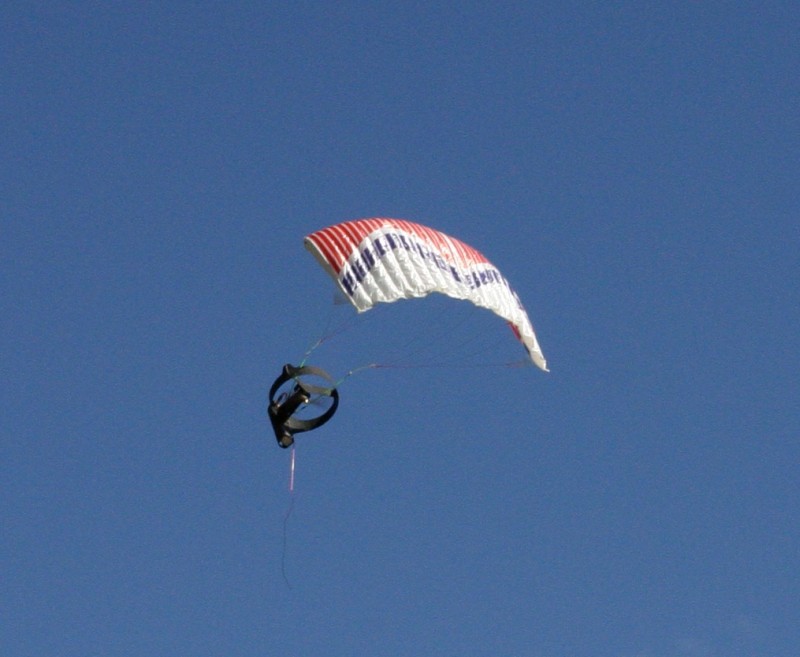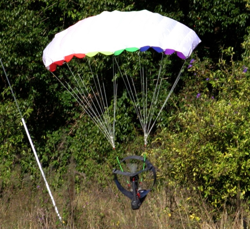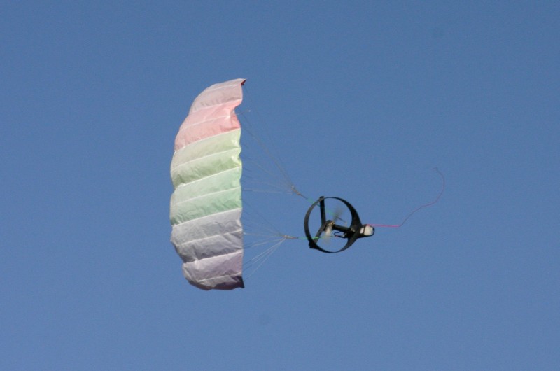 I'd like to report it flew brilliantly but I can't. It has the same problems as the rainbow. The offset motor doesn't seem to help much. The prop is probably too close to the canopy attachment points for it to have much effect. With the plastic chute fitted - it took three or four launches to get it to stay in the air without twisting up the bridle lines and crashing. Once I got it up and cruising it wasn't too bad. The gondola shimmied like both the rainbow and cyber-chute do. I'm pretty sure this is gyroscopic precession problem. A lighter prop should help reduce this.